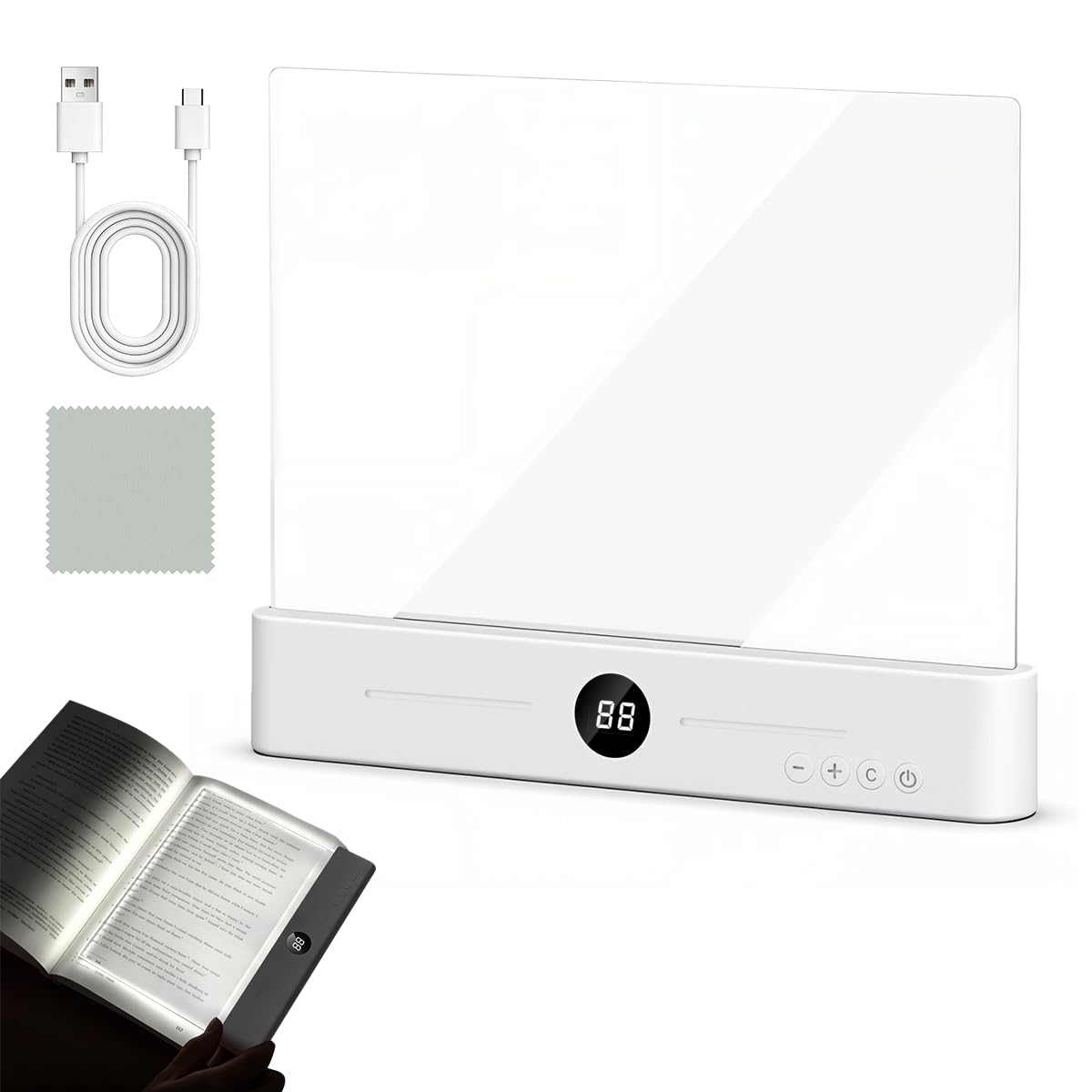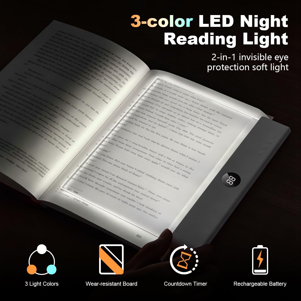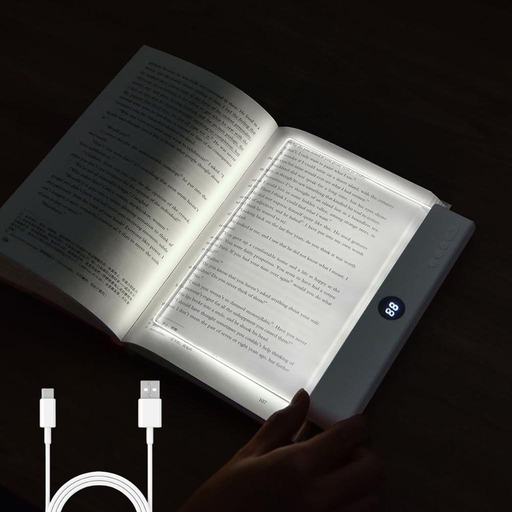 A slim portable LED panel placed over book pages to provide full-page illumination for comfortable night reading without disturbing others nearby.