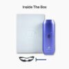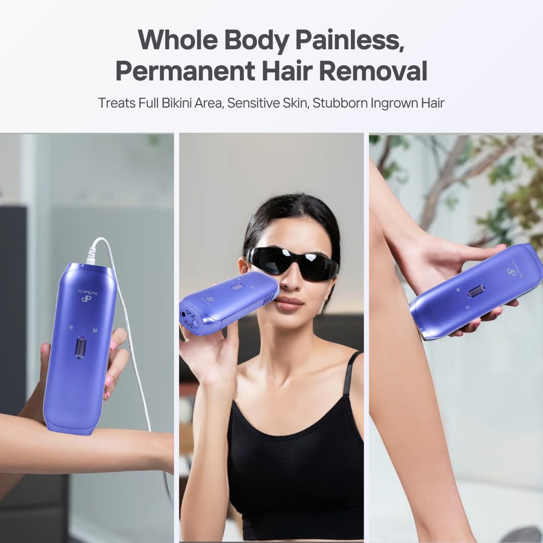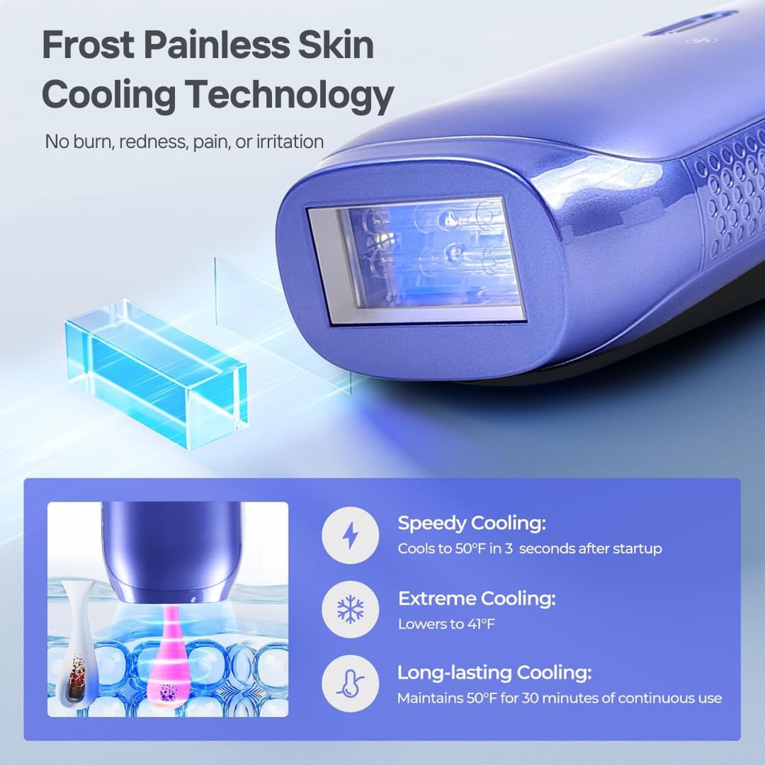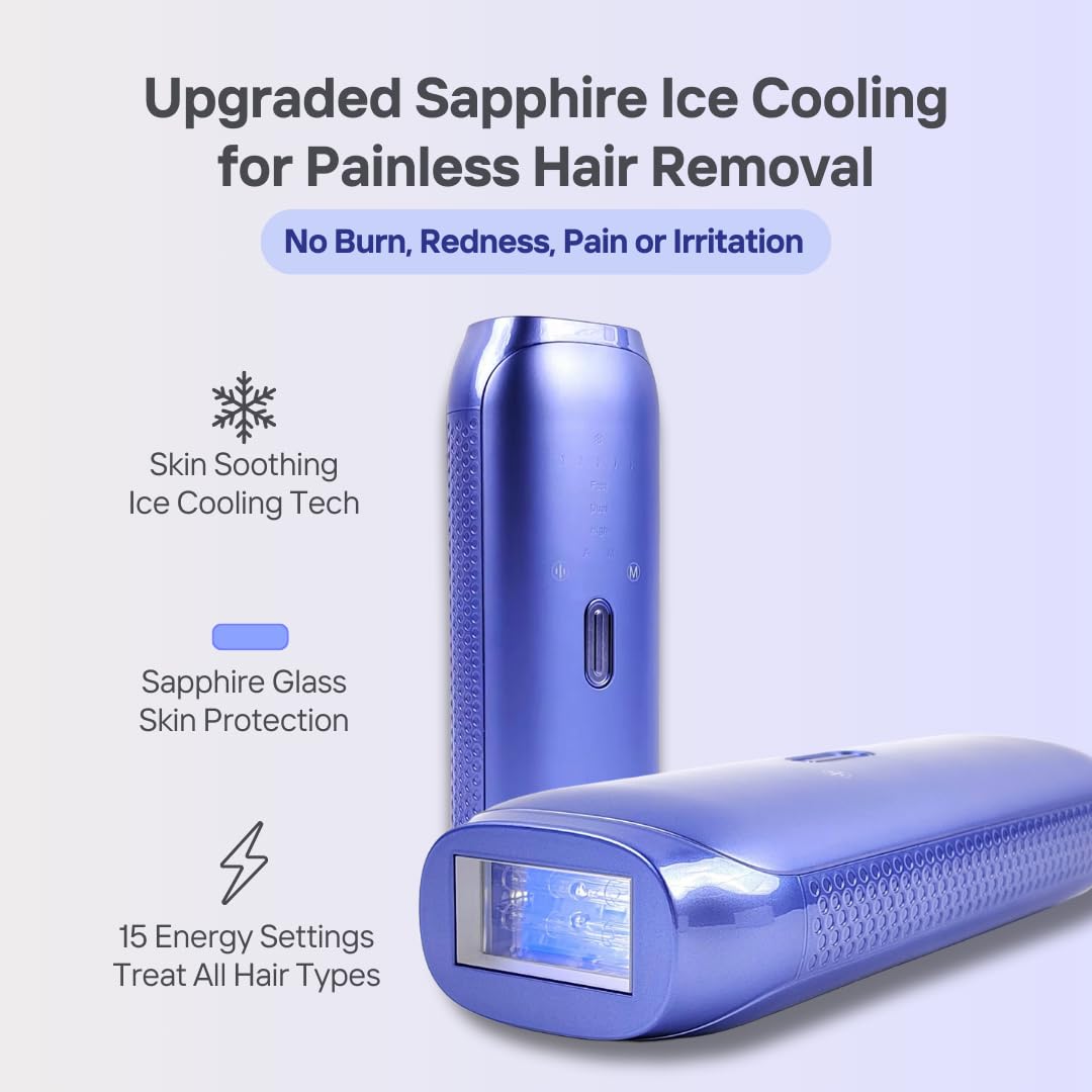 The device features sapphire cooling technology, which helps maintain a comfortable skin temperature during treatment and reduces the chances of irritation or discomfort. It includes multiple energy levels and treatment modes, allowing users to customize sessions for different body areas such as arms, legs, face, and bikini line.