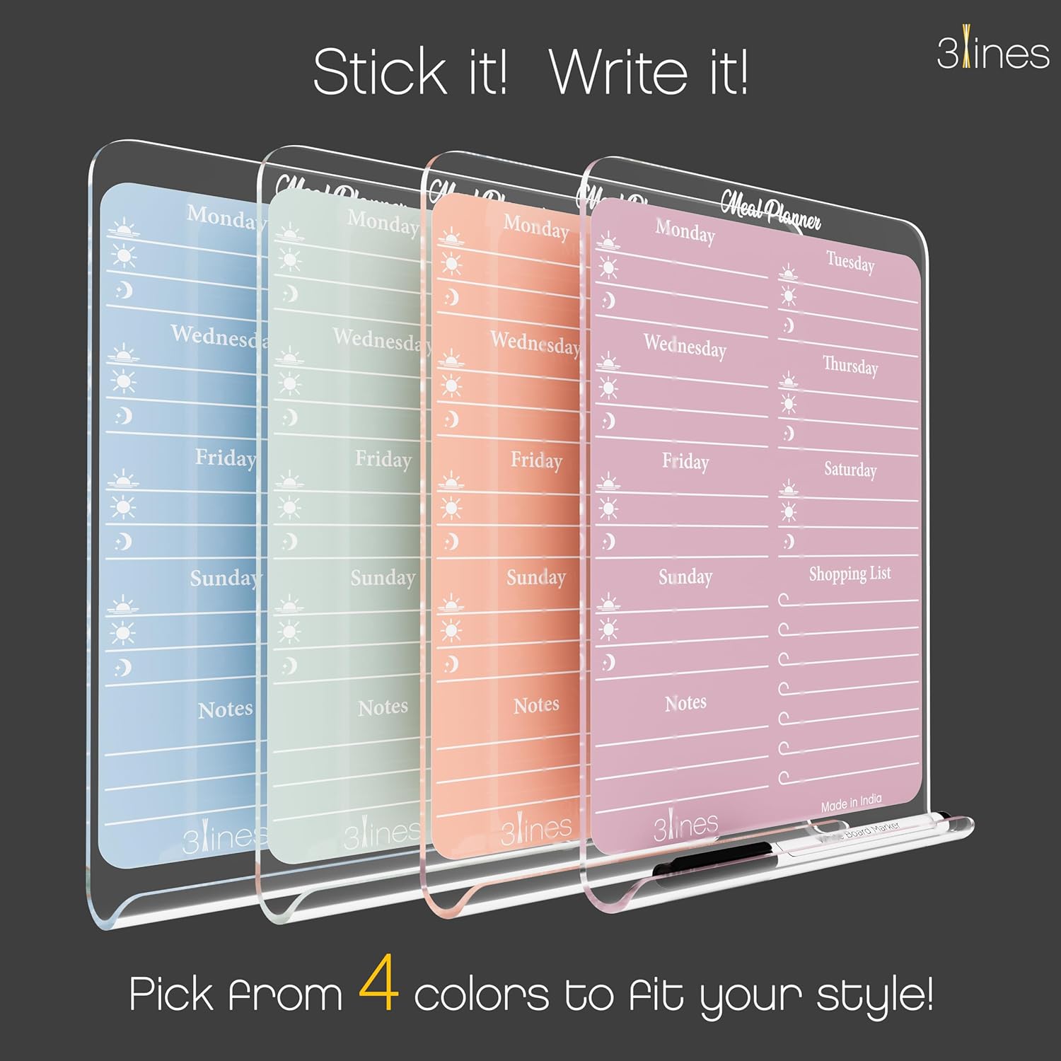 This magnetic acrylic meal planner board is designed to help organize weekly routines, meal plans, and household tasks in a simple visual format. The board attaches securely to refrigerators or other metal surfaces using built-in magnets, making it easy to update plans without using paper notes.