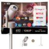 This projector includes Google TV with built-in Netflix and access to thousands of apps, allowing users to stream content directly without additional devices. It can project images up to 120 inches, creating a cinema-like experience at home or outdoors.