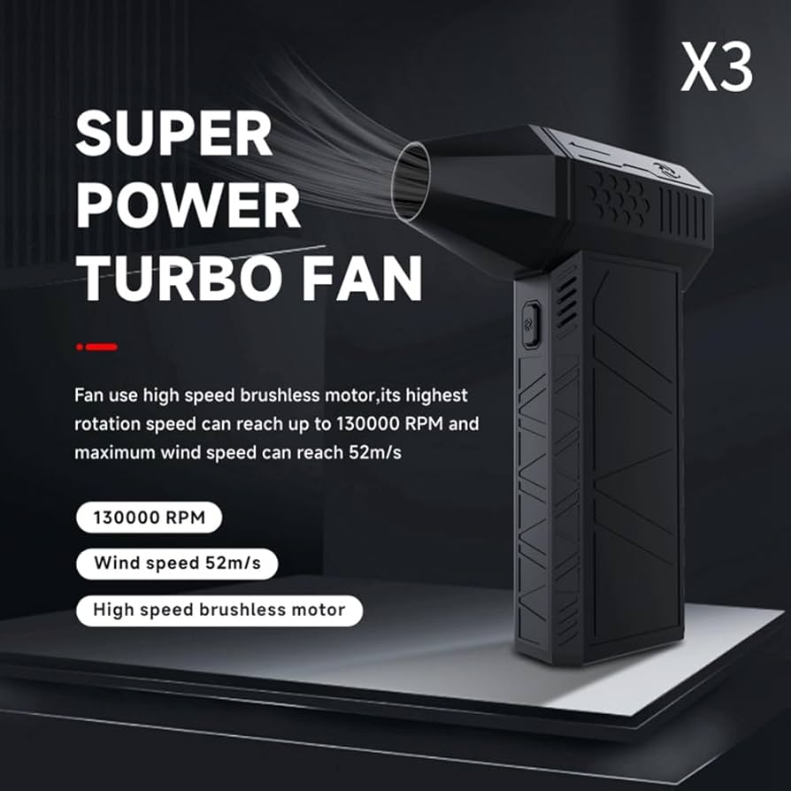 This portable brushless air blower is designed to provide strong airflow for cleaning dust and debris from electronics and household equipment. It uses a 130,000 RPM brushless motor capable of producing airflow speeds up to about 52 m/s, allowing it to remove dirt from keyboards, laptops, cameras, car interiors, and other tight spaces.
